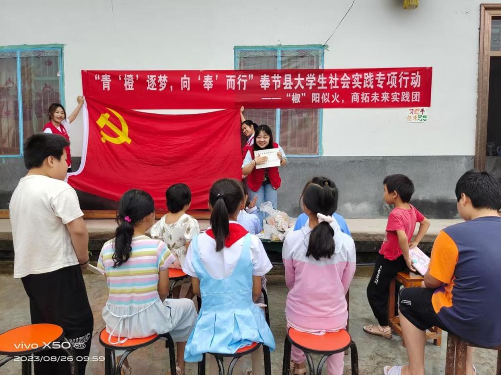 为贯彻落实党的二十大精神,深入学习中国特色社会主义思想理论体系,积极推动习近平经济思想指导实践,引导广大青少年坚定理想信念,8月26日上午,437437必赢国际“椒”阳似火,商拓未来实践团一行前往石岗乡中入选“一村一品”示范村镇的明水村开展习近平经济思想教育宣讲活动。实践团成员们结合专业特点,以习近平新时代中国特色社会主义经济思想为主题,为明水村的小朋友开展了宣讲,以帮助青少年儿童了解国家时事政治,学习国家先进理论思想,激发孩子的爱国热情。