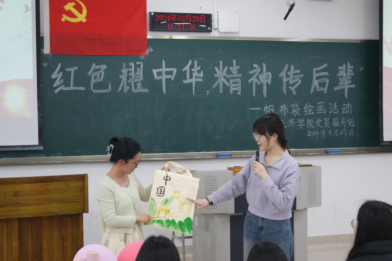 为了增强同学们的爱国主义情怀,激发同学们的创造力,437437必赢国际党员服务站于3月29日举办“红色耀中华,精神传后辈”——帆布袋绘画活动,以此弘扬“红色精神人人承,红色基因代代传”的爱国主义精神。本次活动由22国贸实验班刘星美同学主持,共50余名同学参与其中。