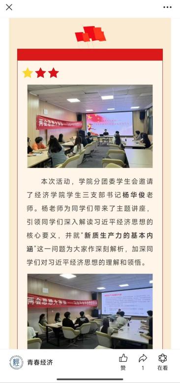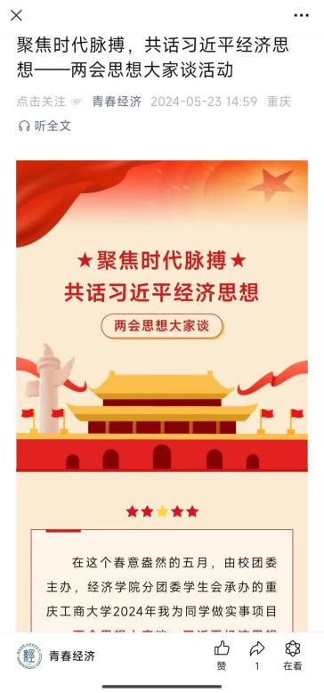 为进一步扩大“两会思想大家谈——习近平经济思想主题讲座”的影响力,聚焦时代脉搏,共话习近平经济思想。本次两会思想大家谈——习近平经济思想宣讲活动在线下开展的同时也采用线上推文宣传形式,5月23日于“青春经济公众号平台”上进行了线上推广。推广宣传内容主要包括“两会思想大家谈——习近平经济思想主题讲座”内容。引领同学们深入研究、不断感悟,坚定地信仰习近平经济思想;经世致用、知行合一,忠实地践行习近平经济思想;广泛宣传、积极弘扬,积极地传播习近平经济思想。