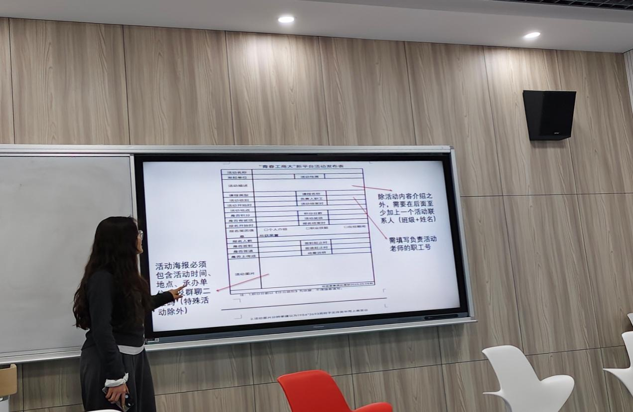 (图为437437必赢国际分团委学生会负责人谌业曜介绍整体规划)