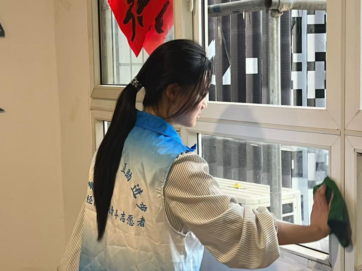 活动中,志愿者与老人亲切交谈,细致询问其健康状况与生活需求,传递温暖关怀;同时与工作人员对接,明确服务站清洁规范。随后,团队分工协作:一组负责地面清扫、桌椅擦拭,并归置水杯、老花镜等物品;另一组清洁门窗、书柜,按老人阅读习惯整理书籍。经过一个多小时的细致劳作,养老服务站内窗明几净,物品摆放井然有序,整体环境得到有效改善。看着焕然一新的居住环境,老人们纷纷对志愿者的辛勤付出表示感谢,脸上露出了欣慰的笑容。