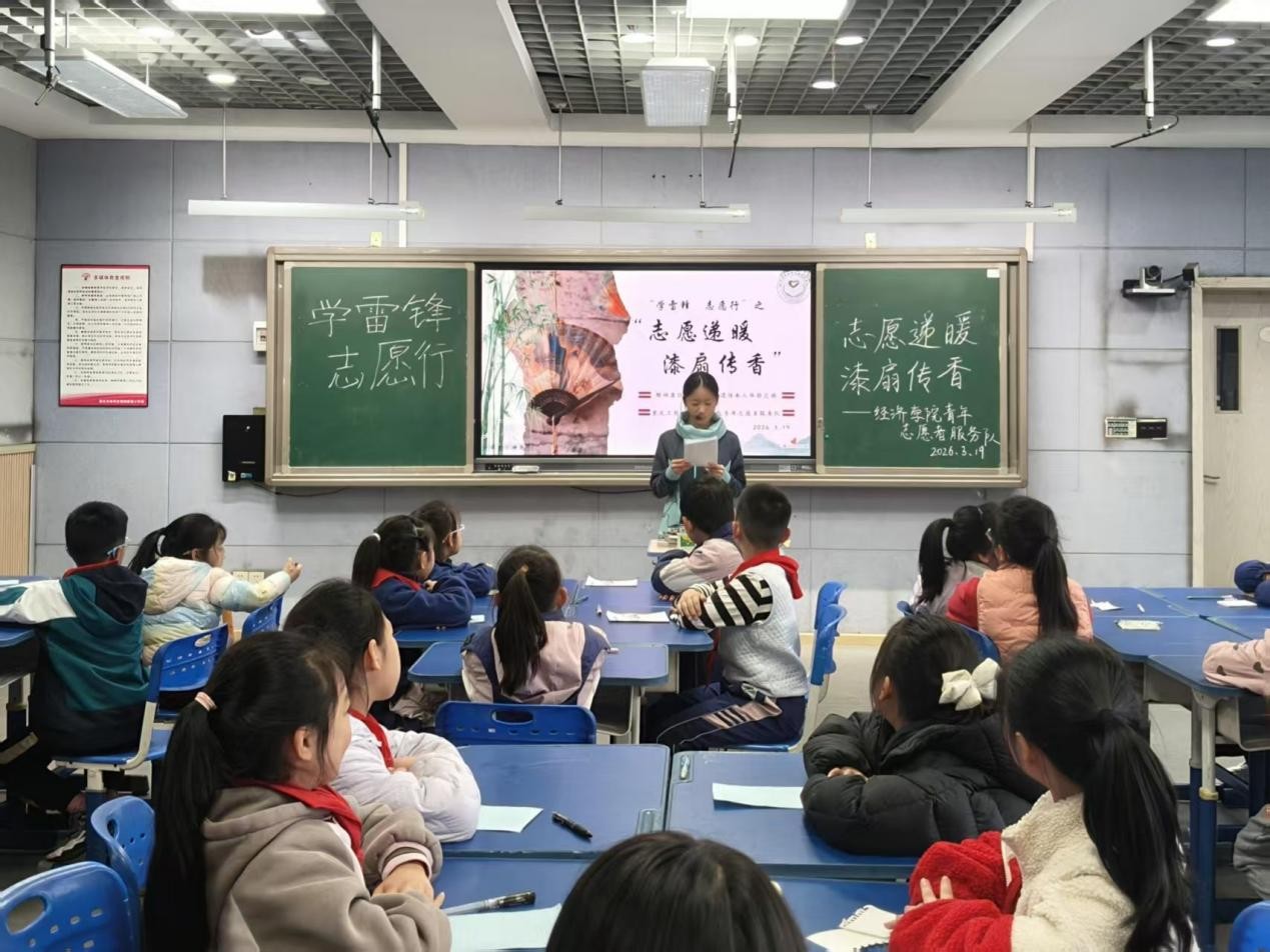 在文化传承领域,志愿者们走进珊瑚小学,开展“非遗漆扇进校园”特色活动。活动现场,志愿者们化身“文化传播者”,用生动的故事讲解漆艺千年发展历程,手把手教授孩子们漆扇绘制技艺。当孩子们拿起画笔,在扇面上勾勒出色彩斑斓的图案时,古老的非遗文化在童真的眼眸中焕发新生,不仅播撒下文化传承的种子,更在潜移默化中培育了青少年的文化自信。