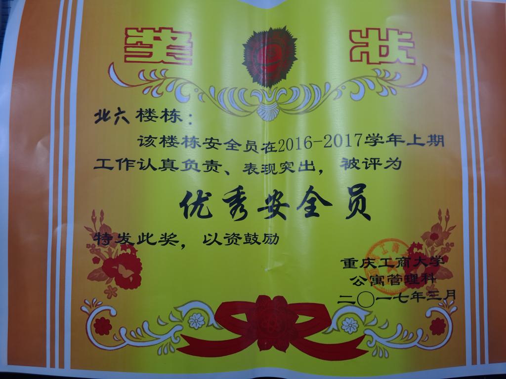 在开学第二周,我校完成了优秀安全员评选活动,全校共评选出5名优秀安全员,北六楼栋安全员以总分第二排名入列。北六栋的楼栋安全员在平时工作中积极认真负责,为楼栋的发展做出重大的贡献。这是我院楼栋管理的一项殊荣,也是学校对我院楼栋干部辛勤工作的肯定。
