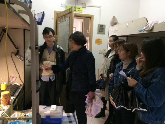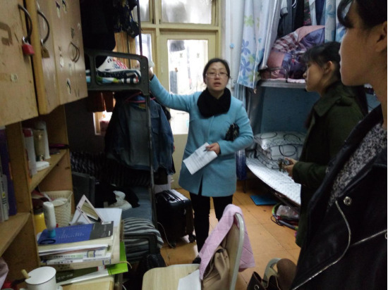 北区21栋是我院主管楼栋,也是全院男生集中住宿的楼栋。王书记、喻智成老师携学院女生楼栋干部代表一同对北21栋寝室进行了抽查。南区2栋住宿条件略差,集中住宿我院100多名女生,于书记携楼栋干部对该楼栋我院的21间寝室进行了逐一检查。