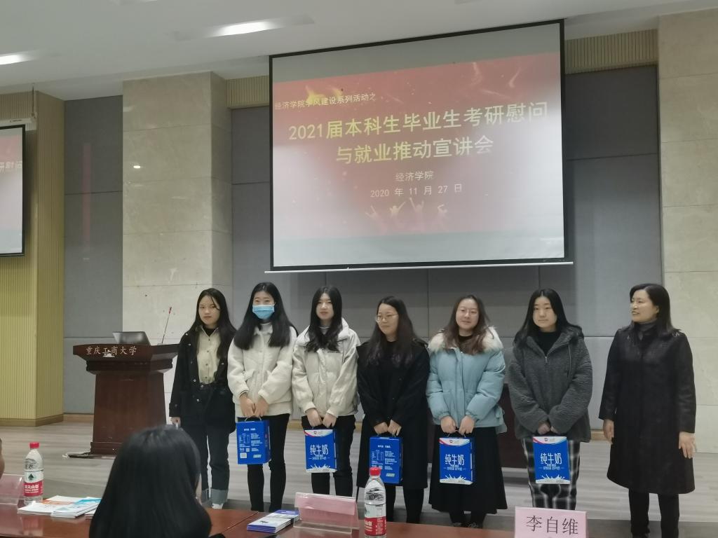 会议伊始,437437必赢国际分党委副书记、副院长王燕教授向大四同学强调毕业的注意事项,劝诫大家高度重视毕业实习、企业招聘与考研备考,督促大家做好学习、工作、生活的准备。殷切寄语后,437437必赢国际分党委书记李自维教授为大四学生代表颁发慰问奖品,表达学院的关心。随后,渤海证券有限公司祝贵臣先生、心田花开杜亚明女士和斐乐服饰有限公司谢广智先生依次上台宣讲,分享工作经历,介绍各自公司企业文化、员工培养模式和薪资待遇晋升等内容,充分调动现场同学的参与积极性。最后,同学们积极与企业代表沟通交流,纷纷表达对学院的感谢。