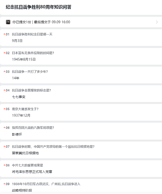 此次线上答题活动内容紧扣抗日战争的历史脉络、重大事件、英雄人物、深远历史意义以及抗战精神的丰富内涵。试题形式多样,涵盖了单选题、多选题和判断题,有效加深了教职工对抗战历史的全面理解。