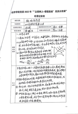 在示范课中,授课教师紧扣专业课程教学内容,深入挖掘其中所蕴含的“思政元素”,将爱国情怀、品德修养、科学精神、思维方法等巧妙融入到专业授课内容中,体现了“课程思政”、“课程育人”的理念和要求。教工一支部党员刘晗老师的《经济研究方法与写作》课程采用引导式教学法,激发学生主动思考,并结合热点问题融入思政元素;教工一支部党员刘斌老师的《微观经济学》课程设计了新颖有趣的导入案例,通过生动的案例与图解,充分调动学生参与课堂的积极性;教工二支部党员张驰老师的《流通经济学》课程以生动有趣的案例导入,并结合工匠精神巧妙融入思政要素,深入浅出讲授了流通实现及其效率;教工二支部党员孙畅老师的《城市商业区开发实务》课程结合丰富案例打造了生动有活力的课堂,以真实问题情景引导学生将知识融会贯通、学以致用;教工二支部党员黄玲老师的《现代服务贸易概论》课堂充分运用“学习通”平台与学生互动,充分调动学生课堂参与积极性,课堂讲授生动活泼,富有吸引力;教工二支部党员王疏影老师的《研究与咨询方法》引导学生通过总结汇报和交流讨论的方式,掌握学术论文写作的方法,充分调动学生主观能动性,激发学生思考;教工四支部党员张充老师的《公债学》课程通过对美国、欧盟与我国关于国债管理的案例进行对比,阐述我国国债管理制度的优势,潜移默化地将思政教育贯穿课堂;教工四支部党员汤凤林老师的《国际税收》课程中将国内外的国际税收案例进行对比,突出我国政策的优越性,增强学生的国家认同感,坚定学生对中国特色社会主义道路的信心;教工五支部党员林黎老师的《政治经济学》课程结合具体案例讲授“按劳分配为主体、多种分配方式并存”的基本分配制度,实现课堂教学与思政元素的融合;教工五支部党员吴正俊老师的《政治经济学》课程讲授了社会主义市场经济体制改革的历程,结合历史事件阐释社会主义市场经济体制不断完善发展的根本原因在于始终坚持和加强党的领导,从而将思政教育贯穿课堂教学。