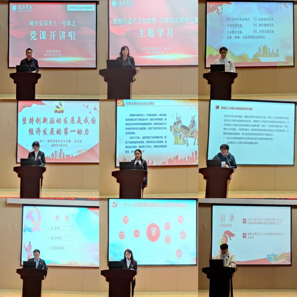 随后,7名师生党员围绕习近平经济思想展开宣讲。学生三支部陈达同学深入阐释了贯彻创新、协调、绿色、开放、共享的新发展理念的重要意义;学生四支部马子欣同学围绕“坚持创新驱动发展是我国经济发展的第一动力”,介绍了创新驱动发展的案例、原因和措施;教工三支部刘霜老师讲述了统筹发展和安全的必要性、阶段性成果、面临的挑战,强调了坚持总体国家安全观,统筹发展和安全,防范化解重大安全风险的重要性;教工四支部张充老师讲述了新型城镇化对支撑中国式现代化建设的重要作用,以及如何推进以人为核心的新型城镇化战略;教工五支部车四方老师围绕大力发展制造业和实体经济,深入阐述其背景、必要性和实现路径,强调坚持制造业高质量发展目标,走制造业高质量发展之路;研究生三支部蒋依伶同学阐述了我国经济发展的根本立场,即坚持以人民为中心,在发展中保障和改善民生,坚定不移走共同富裕的道路;研究生四支部何建同学深入分析了在全面建设社会主义现代化国家的新征程上,要坚定不移深化市场化改革,加快完善社会主义市场经济体制。