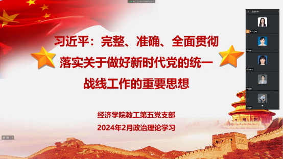 2024年2月22日,437437必赢国际教工第五支部通过企业微信开展二月组织生活,集体学习习近平总书记在中央统战工作会议上讲话精神,即完整、准确、全面贯彻落实关于做好新时代党的统一战线工作的重要思想。