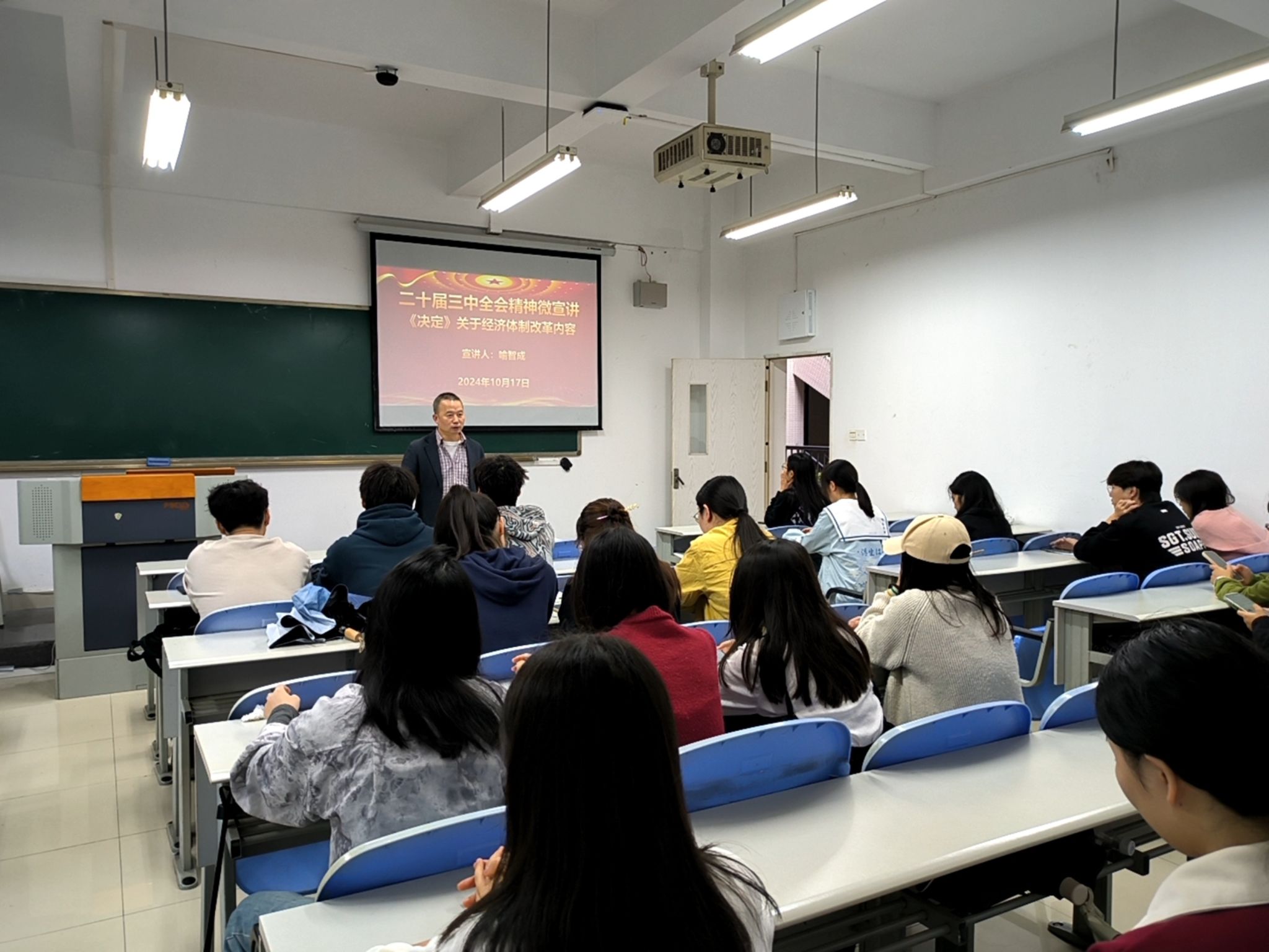 为深入学习贯彻党的二十届三中全会精神,进一步统一思想、凝聚共识、推动高质量发展,10月17日,437437必赢国际党委学生二支部学习贯彻党的二十届三中全会精神宣讲会在田家炳205教室举行。437437必赢国际党委雷菁组织员、学生二支部书记喻智成、学生二支部全体党员及部分团干部代表等参加宣讲活动。