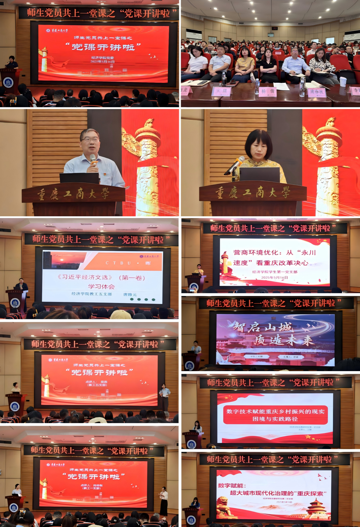 活动第二个环节围绕“习近平经济思想的重庆实践”展开,四位学生党员结合重庆地方经济发展实际进行党课宣讲,两位教工党员进行点评。学生一支部陈曦以《营商环境优化:从‘永川速度’看重庆改革决心》为题,结合习近平经济思想中“支持民营经济发展”的论述,阐述了优化营商环境对激发市场活力,推动经济高质量发展的重要性。学生二支部徐睿以《智启山城 质造未来——制造业‘33618’集群体系的智造跃迁》为题,分析了重庆“33618”现代制造业集群建设的显著成绩和未来蓝图,阐述了科技创新在培育经济增长新动能方面的核心作用。研究生一支部王敏以《数字技术赋能重庆乡村振兴的现实困境与实践路径》为题,探讨数字技术在乡村振兴中的应用,诠释了习近平经济思想的创新发展理念。研究生二支部秦浩宇以《数字赋能:超大城市现代化治理的“重庆探索”》为题,介绍了数字赋能重庆智慧治理的背景、实践、挑战和未来规划,展现了数字经济在提升城市治理效能、推动经济高质量发展中的关键作用。教工五支部吴燕老师和教工一支部肖伶俐老师在点评中指出,党课紧密结合国家战略与重庆实际,展现了习近平经济思想的实践运用,并鼓励同学们将专业知识与地方发展需求结合,为数字重庆建设和乡村振兴贡献智慧力量。