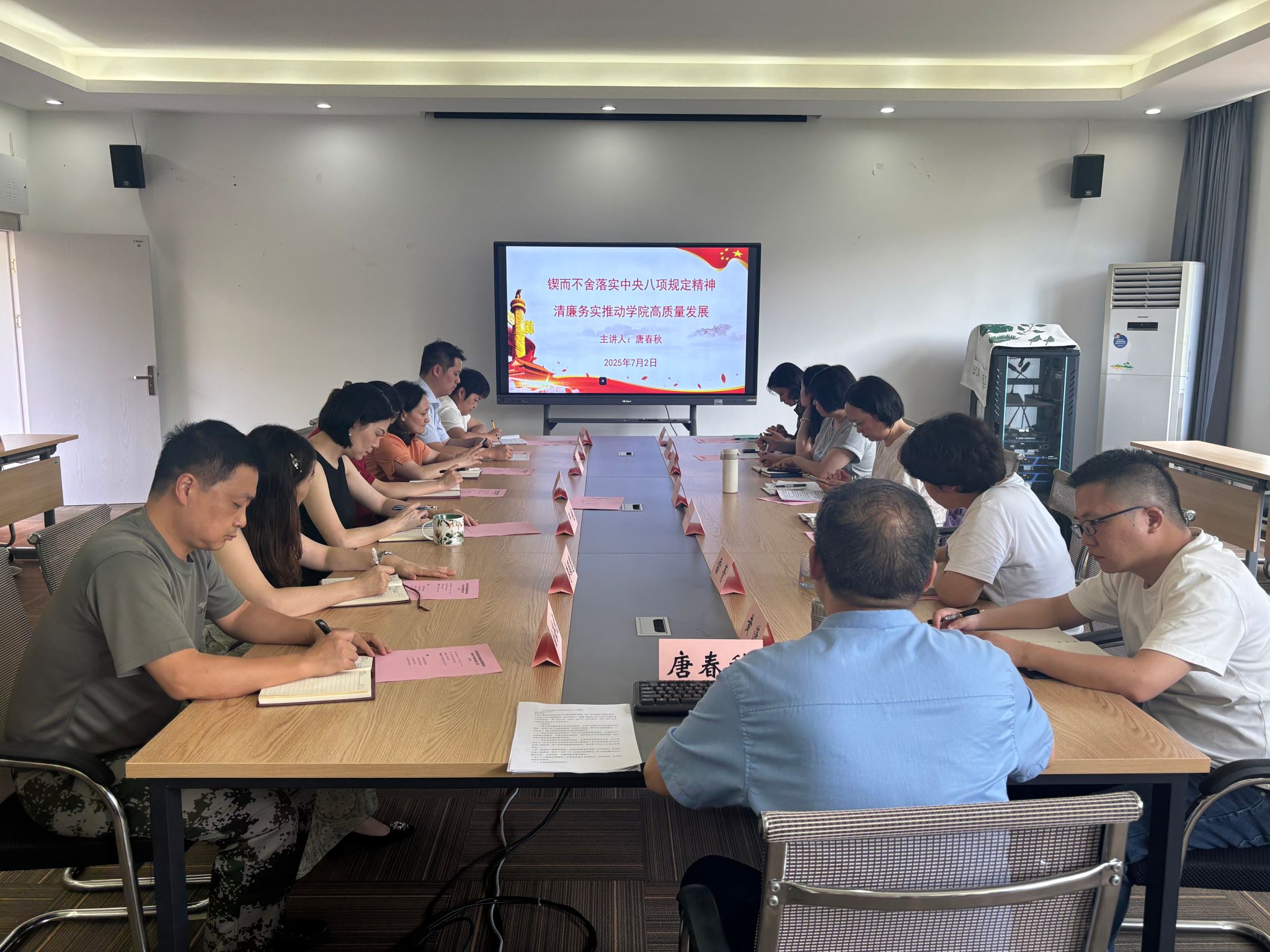 会上,唐春秋书记从“加强党的作风建设”“八项规定改变中国”“推进作风建设常态化长效化”“清廉务实推动学院高质量发展”四个方面,深入阐释了中央八项规定在党的作风建设史上的里程碑意义,交流分享了贯彻落实中央八项规定精神的成效经验,明确了推动学院高质量发展的努力方向和务实举措。