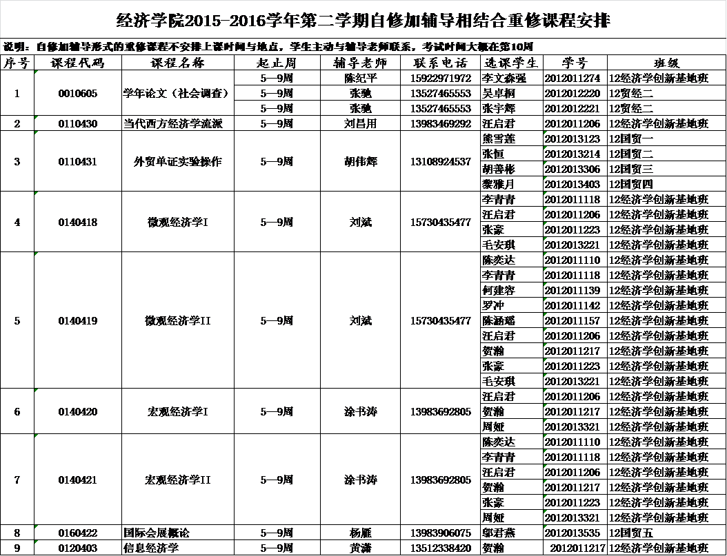 根据学校教务处《关于开展2015-2016学年第2学期在校生重修选课及报名工作的通知》,自修与辅导相结合属于特殊的单独开班的重修方式,只适用于教学计划变更(包括低年级不再开设和课程代码变更)和第7学期不合格课程的重修。现将符合上述两种情况的课程安排公布,详情见附件。