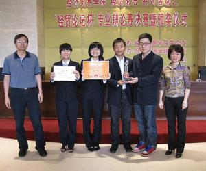 本次辩论赛决赛的对阵双方是08级国贸三四班代表队(正方)和07级贸经一、经济学班代表队(反方),双方就“中国铁矿石进口采用长期价格好”和“中国铁矿石进口采用短期价格好”展开了唇枪舌战,双方辩手才思敏捷、旁征博引、字字珠玑,可谓针锋相对,精彩纷呈,博得了评委和观众们的阵阵掌声。在自由提问环节中双方场外观众均积极踊跃地参加,为比赛又添一抹亮彩。国贸系张宝均教授代表评委从专业知识和辩论技巧的角度对本场辩论赛进行了精彩点评。最终,08国贸三四班代表队(正方)摘得桂冠。