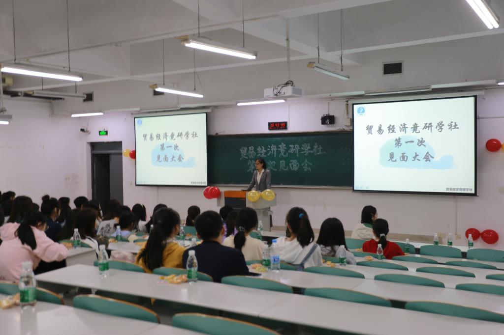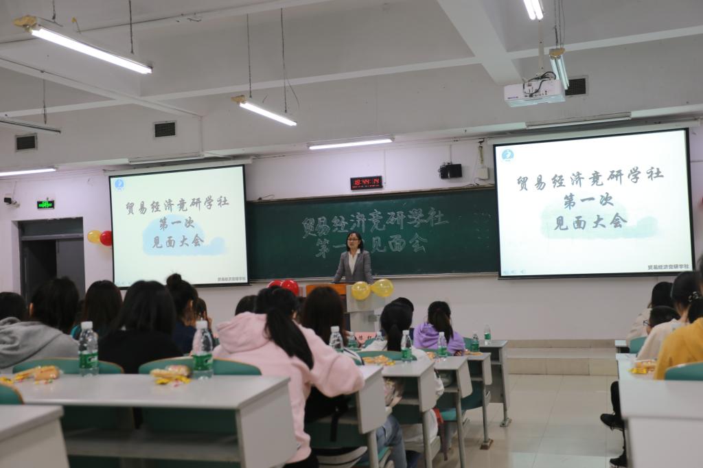 2020年11月13日我校专业性社团贸易经济竞研学社在437ccm必赢国际南岸校区博智楼121教室举行了2019级、2020级干事会员的第一次成员暨工作职责报告大会。出席这次大会的有437437必赢国际贸易经济系系主任杨海丽,贸易经济竞研学社社长团,五个部门的部长和副部长,以及全体干事会员。