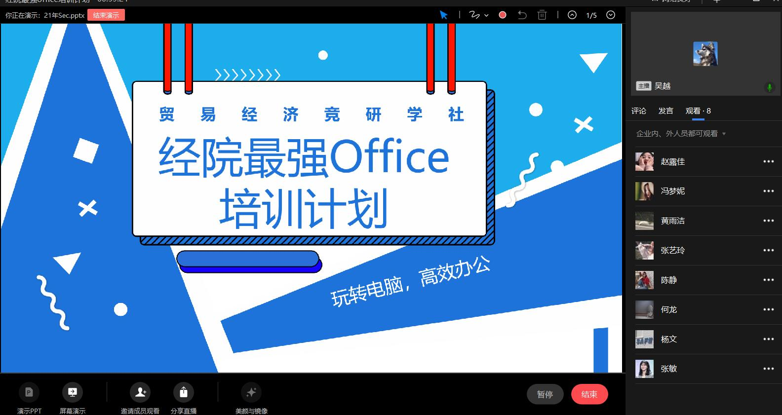 随着主持人赵露佳同学宣布活动开始,本次培训活动拉开了序幕。社团指导老师喻智成向参会同学介绍了本次活动的背景,他指出,熟练掌握office,是大学生必备的技能,是同学们今后在工作中经常都要用到的办公工具,如果能够熟练掌握,将会领先别人一步,希望同学们在今天的培训中学有所获。接下来,由社团骨干成员吴越同学向大家仔细讲解了Excel部分操作技巧和PPT的操作技巧,就大家在日常工作中经常用到的技巧向参会同学逐一讲解。然后由线上的专业人员讲解比较难一点的使用技巧,大家观看学习视频。最后是互动环节,发言同学向讲解人员提问,讲解人员给出解决办法,互动环节把整个活动推向了高潮。随着主持人宣布分享交流会结束,大家意犹未尽的退出会议。