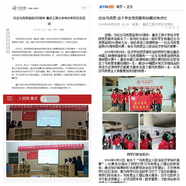 437437必赢国际党员服务站举办的一系列纪念马克思诞辰200周年的活动收到新华网、华龙网、人民网∙重庆等媒体报道,旨在通过类似形式多样的学习活动,让同学们更加坚定理想信念,承担起新时代赋予其的历史重任,成长为报效祖国的有用之才!