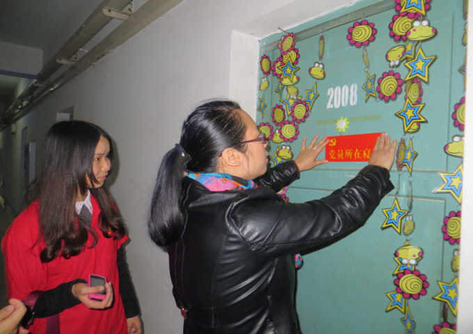 下午四点半,北六栋公寓静静的楼道上泛起阵阵脚步声,党服的站长们开始为党员所在寝室挂牌(党员所在寝室),和以往不同,本次挂牌采用塑胶泡沫制成,比往届所用的塑料纸更加鲜艳大方。百忙之中的郝颖老师也抽出时间来参加这次重要活动。经过老师和同学的配合,挂牌工作有条不紊的进行,积极而效率的完成工作,当同学们学习之后回到寝室,“党员所在寝室”的挂牌殊荣一定会同学们有更大的激励。最后挂牌活动有段小插曲,郝颖老师细心整理了楼栋的宣传栏,精心细致的工作态度给党服的每位同学树立了榜样。