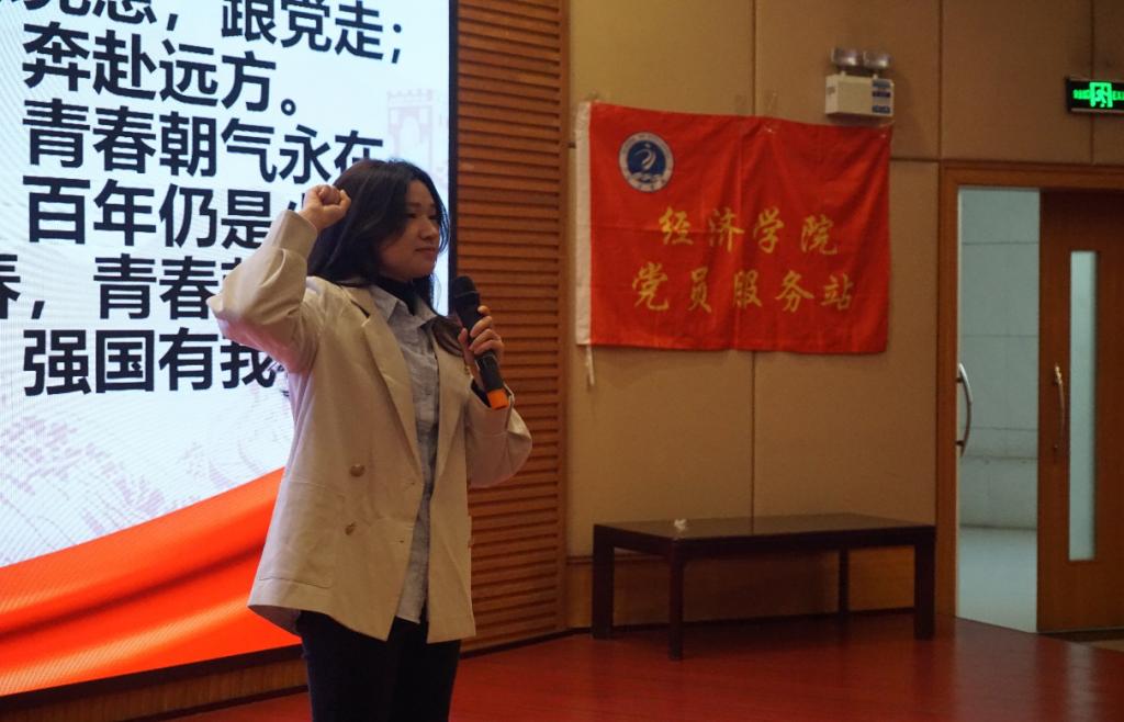 听完李治贤老师精彩的讲述后,主持人邀请了两位同学分享其感悟与收获。其中,20级国贸三班的周叶凡表示青年学子应将个人价值与社会价值相结合,努力学习先进党员的优秀品质,为社会的进步与发展贡献自己的一份力量;20级国贸三班的李新荣感触颇深,她结合李老师的讲解,通过实例分析的方式论证了党和人民的无限智慧与伟大创造力,同时鼓励在场站员能够以史为鉴,不断汲取我党在百年奋斗历程中积累的经验与智慧。最后,437437必赢国际研究生代表汪林静带领全体参会人员进行宣誓。站员们高举右手、目光坚毅,共同许下了立志成才、报效祖国的誓言,在庄严肃穆的党旗面前更加坚定了为党的事业奋斗终生的决心和勇气。