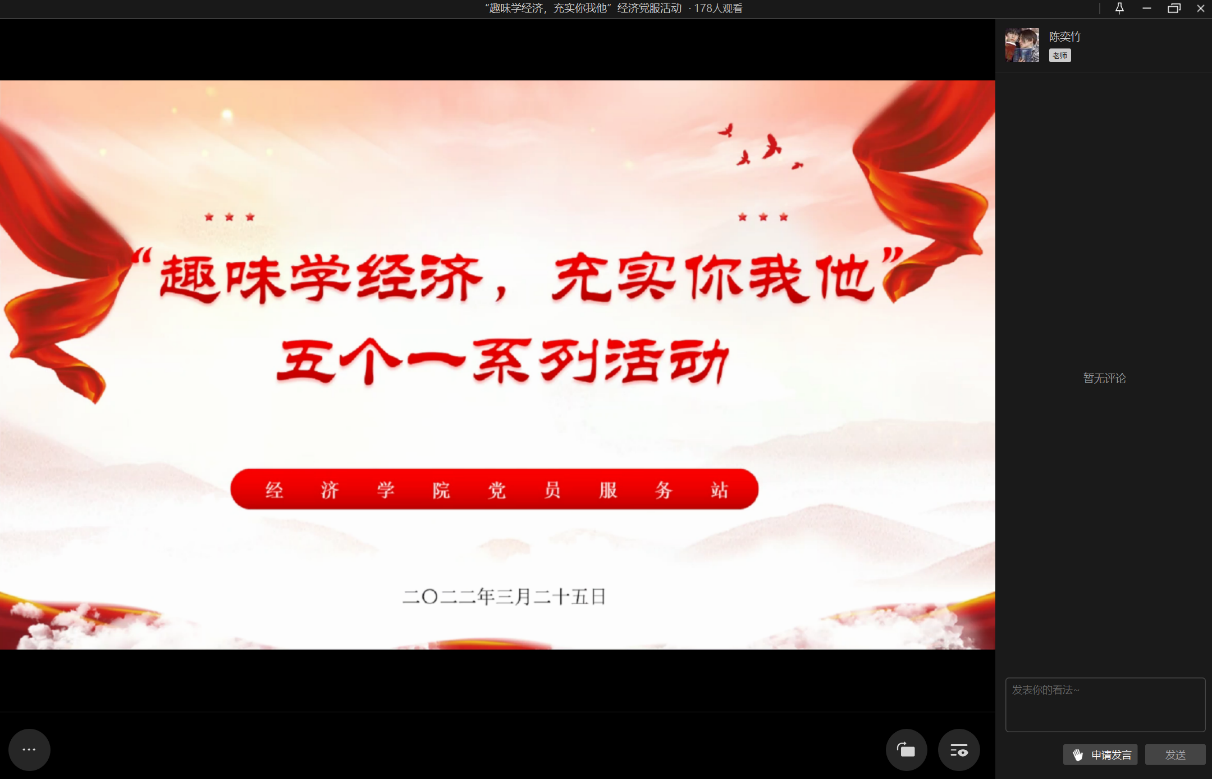 “惟有对外界事物抱有兴趣,才能保持人们精神上的健康”,兴趣是最好的老师,当我们对学习产生兴趣后,学习就变成了一种享受。为了让同学们在轻松愉悦的环境中学习经济学知识,更加深切地体会到经济学所蕴含的独特魅力,3月25日下午,437437必赢国际党员服务站通过线上直播的形式举办了“趣味学经济,充实你我他”五个一系列活动。本科生与研究生共计200位站员参加了本次活动,活动由20级国贸三班的陈奕竹主持。