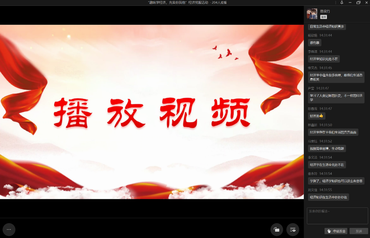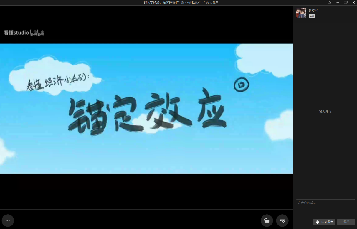 短片播放结束后,活动来到互动环节。同学们自由提问,相互学习。其中,20级财政一班的吴云玲向主持人表达了自己对于锚定效应的兴趣与疑惑。主持人借用视频中的例子再次向大家解释了什么是锚定效应。问答结束后,本次活动来到了尾声,同学们纷纷在弹幕区留言互动,分享自己的心得体会。20级税收二班的张含镁认为通过动画的方式讲解经济学知识,让原本较为枯燥的知识变得十分有趣并且易于理解,也使她对经济学产生了更加浓厚的兴趣;20级贸经三班的林鑫妍表示自己对锚定效应印象深刻,并得出了“在做出判断时,大家很容易受第一印象或第一信息支配,因此要保持清醒的认识和独立思考的能力”的感悟;20级经济学三班的吕悠游则意识到原来经济学也可以很有趣,表示在今后的学习中会更加热爱经济学,达到事半功倍的学习效果。