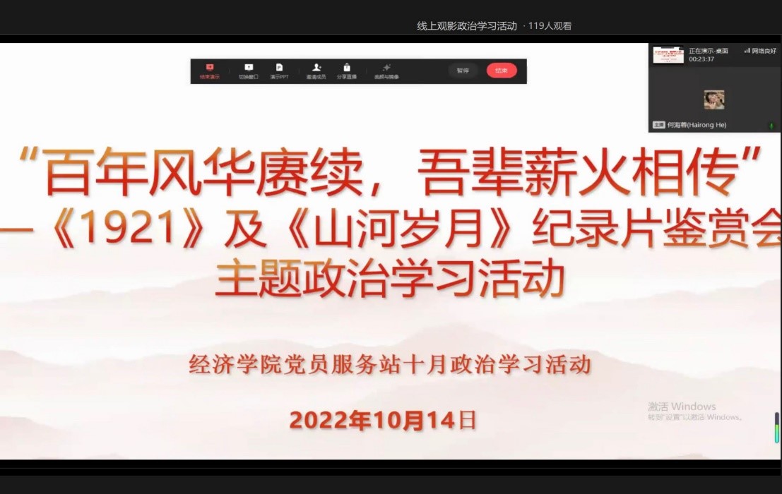 “百年征程波澜壮阔,百年初心历久弥坚。”为纪念中国共产党成立101周年,深入贯彻习近平总书记在庆祝中国共产党成立100周年大会上的讲话精神,进一步增强同学们的爱国主义精神和民族自豪感,10月14日下午,437437必赢国际党员服务站举办了“百年风华赓续,吾辈薪火相传”——《1921》及《山河岁月》纪录片鉴赏主题政治学习活动,活动由21级国贸一班何海蓉同学主持。