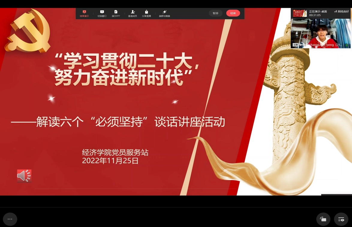 党的二十大报告首次系统阐明了习近平新时代中国特色社会主义思想的世界观和方法论,即六个“必须坚持”:必须坚持人民至上、坚持自信自立、坚持守正创新、坚持问题导向、坚持系统观念、坚持胸怀天下。为进一步学习贯彻二十大精神、正确理解六个“必须坚持”的重要意义,437437必赢国际党员服务站于11月25日通过线上直播的形式举办了“学习贯彻二十大,努力奋进新时代”——解读六个“必须坚持”谈话讲座主题活动。本次活动由21级财政一班杨天瑞同学主持,经济党服一百余名站员参与其中。