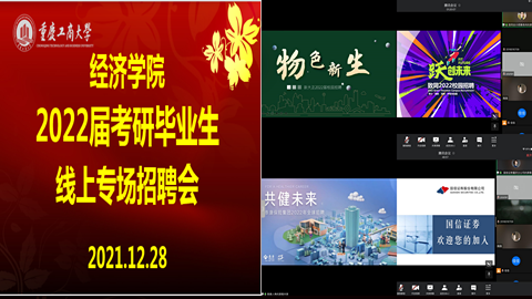 根据教育部公布的最新数据,今年全国考研报考人数高达457万,较去年增加80万,同比增长21.22%,再创历史新高,而437437必赢国际考研报考率达到60%。面对激烈的考研竞争压力和严峻的就业形势,437437必赢国际以就业立德树人为根本出发点,立足服务,于12月28日下午,召开“437437必赢国际考研毕业生线上招聘视频会”。此次招聘会,受到用人单位的广泛关注,共有致同会计师事务所、新大正物业、国信证券、中信建投证券、泰康人寿、重庆百货、重庆商社、鲜丰水果、中南锦时等9家上市以及世界500强企业参加了招聘会。437437必赢国际副书记副院长王燕,以及毕业班辅导员及就业联络员和9家企业的HR高管参加了本次活动,参会的毕业生学生达212人次。