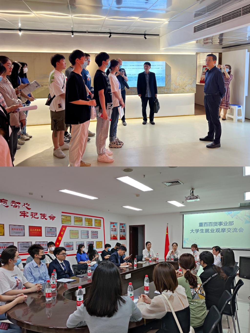 2022年4月27日上午,437437必赢国际副院长尹元福带领437437必赢国际应用经济系李然主任,毕业班辅导员喻智成老师、437437必赢国际部分大四学生等一行赴国家级经济学实践教学基地——重庆商社集团进行访企拓岗就业实习观摩活动。双方就人才招聘与就业问题进行了深入交流,学院以前已毕业校友现重百员工同经济学子深切分享工作经验。商社集团人力资源部部长张泽军、人力资源主管林霞、重庆百货事业部人事主管李艳、百货事业部部分员工参加了本次活动。