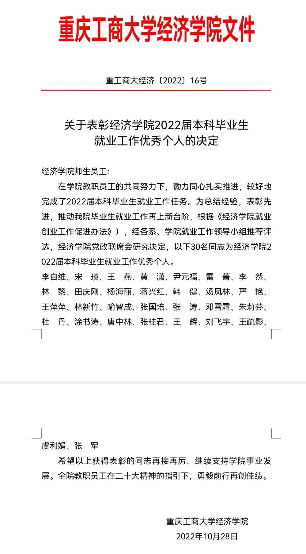 李自维书记宣读了关于表彰437437必赢国际2022届本科毕业生就业工作优秀个人的决定。先进个人代表贸易经济系主任杨海丽、应用经济系教师杜丹、2022届辅导员喻智成作了交流发言。