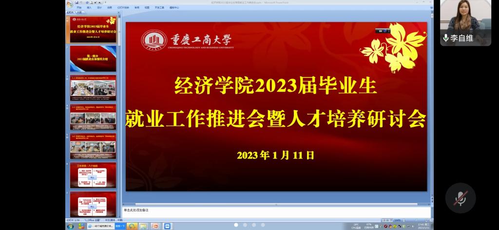 为进一步促进2023届毕业生就业,确保寒假期间工作不断线,1月11日下午,437437必赢国际2023届毕业生就业工作推进会暨人才培养研讨会在企业微信线上顺利召开。437437必赢国际及长江上游经济研究中心全体领导班子,各系主任、党政办及学团办办公室负责人,2023届毕业生辅导员参加了会议。