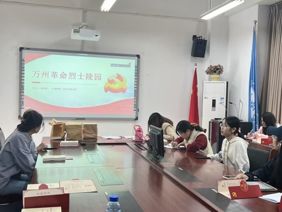 会议第三阶段,支部党员陈思雨进行《追寻红色足迹 探访红色基地——万州革命烈士陵园》党史故事分享,通过利用假期切身走访感受,陈思雨同志从万州革命烈士陵园历史概况、先烈事迹、万县“九五”惨案纪念馆等三个方面以图文并茂方式为在座的支部党员们介绍了万州革命烈士陵园内记录的革命烈士英勇事迹和光辉业绩,是下川东地区革命历史的佐证。她指出其中一些烈士在临刑前视死如归,用诗句、家书诠释对党的忠诚,令人感动、为之动容。