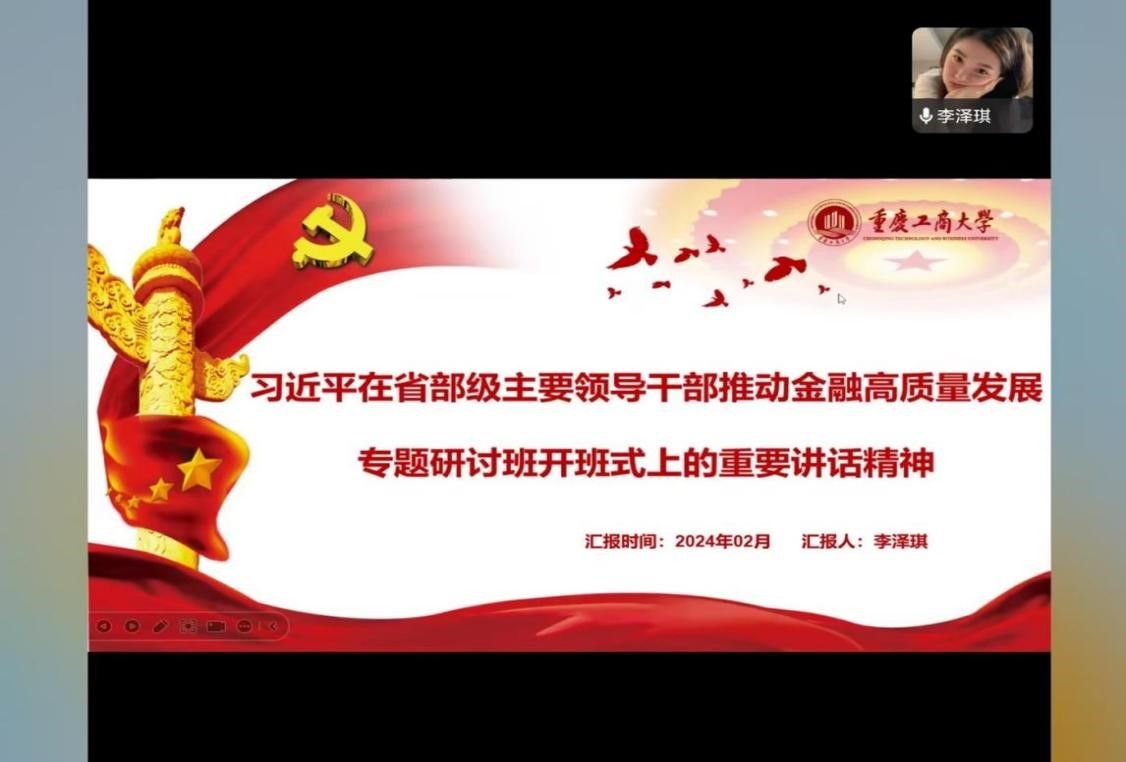 首先由党员马雯钰分享习近平总书记在二十届中央纪委三次全会上的重要讲话精神。经过新时代十年坚持不懈的强力反腐,反腐败斗争取得压倒性胜利并全面巩固,但形势依然严峻复杂。针对这种状况,马雯钰同志分享到,我们对反腐败斗争的新情况新动向要有清醒的认识,要深入推进党的自我革命,坚决打赢反腐败斗争攻坚战、持久战。紧接着,党员李泽琪解读了习近平总书记在省部级主要领导干部推动金融高质量发展专题研讨班开班式上的重要讲话精神。其分享主要涵盖了中国特色金融发展之路、核心金融要素、加快构建中国特色现代金融体系、增强金融思维和工作能力四个方面的内容。要坚持经济和金融一盘棋思想,认真学习中央金融工作会议的各项决策部署,坚持法治和德治相结合,积极培育中国特色金融文化。随后,党员秦怡带领大家学习了习近平总书记对江西市渝水区一临街店铺火灾事故做出的重要指示精神。在详细介绍事件的基本情况后,秦怡同志提出,安全不容懈怠,生命重于泰山。许多安全事故的发生都与人的安全意识懈怠有着直接关联,因此大家务必深刻吸取安全事故的惨痛教训,痛定思痛,树立起安全、正确的安全观念。分享结束后,文理书记对本次组织生活集中学习内容进行梳理与概括,再次强调同志们一定要提高安全防范意识,同时表达了对支部同志们在新的一年里的期望与祝福。