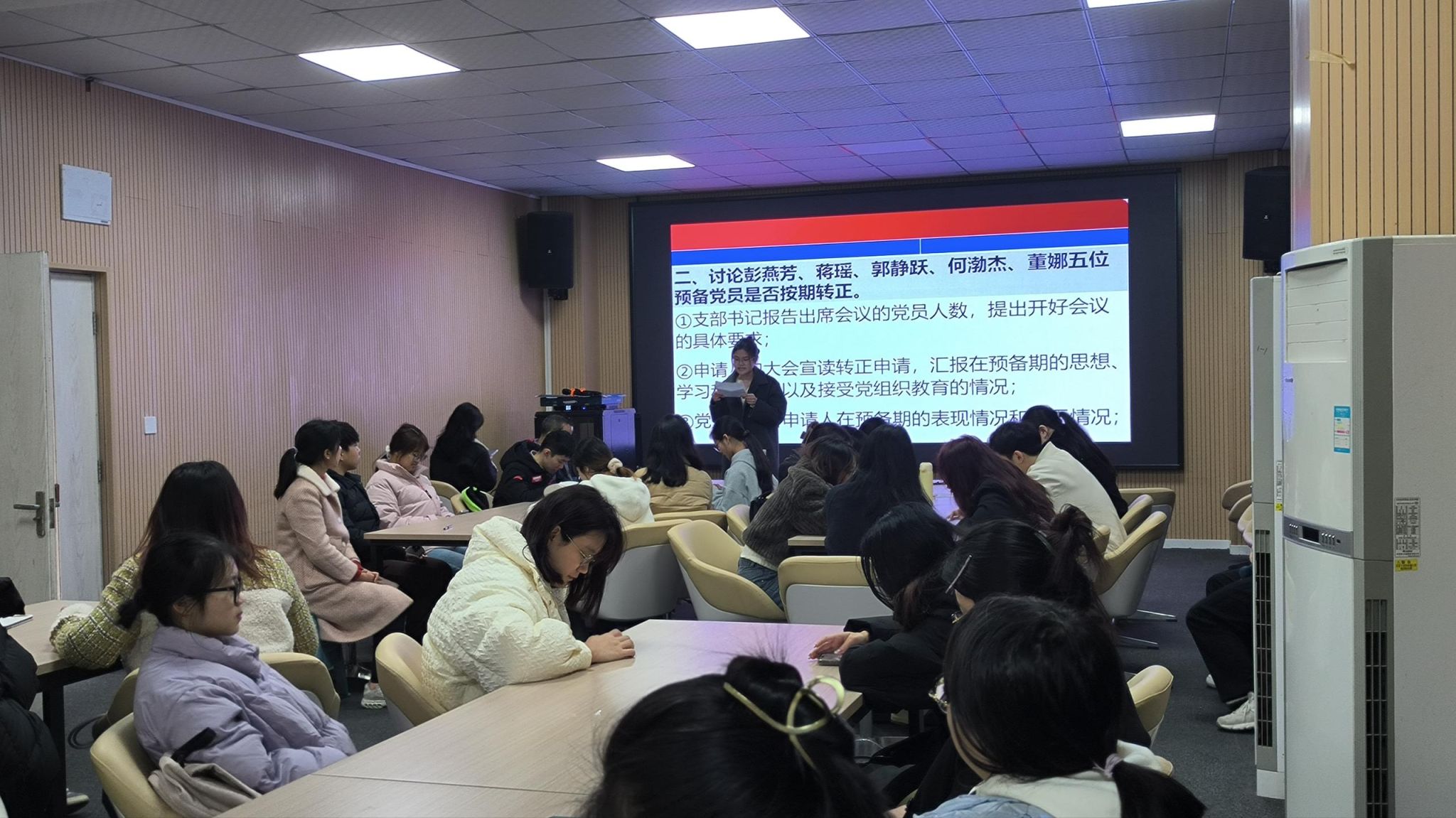 按照活动安排,对照党员发展程序,大会依次对李明明和颜欣悦两位发展对象吸收为中共预备党员进行了讨论、审议和票决,一致同意两位同学发展入党。依照党员转正程序,大会依次对彭燕芳、蒋瑶、郭静跃、何渤杰、董娜五位预备党员按期转正进行讨论、审议、票决,一致同意五位同学按期转正。支部党员赵顺晶、徐睿、严镔莹、李晋丞、周春燕、张凯璇对11月份组织生活学习内容进行了领学和交流。