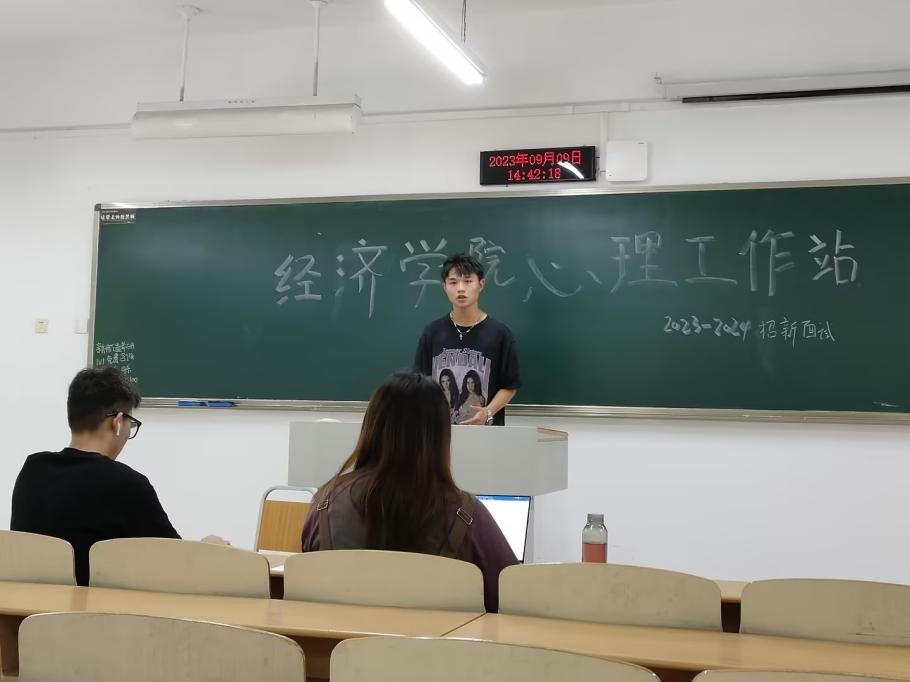 心理工作站站长张远波首先对参加招新的同学们到来表示欢迎,同时介绍了心理工作站的组织结构和规章制度,并详细讲解了心理工作站的相关工作,明确站员们的工作职责。随后,前来参加竞选的同学依次进行简单的自我介绍,说明意向部门、回答工作站负责人提出的相关问题等,招新氛围融洽轻松。同学们积极地表达自己加入工作站想法,迫切希望加入新的组织让才艺得到发挥。