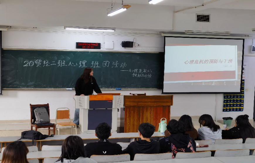 以21级财政二班、20级贸经二班为代表的一批班级开展了“心理危机预防与干预”心理主题班会。21级财政二班此次班会活动通过PPT解说、播放视频等形式展开。班会内容涵盖学生常见心理问题、心理健康判断标准、心理问题解决方法、人生价值取向导航等多个方面。班级内开展辩论、同学讨论。本次活动促进了同学们自觉维护自身的心理健康,建立自信,增强心理素质,在班级内营造了一种关注心理健康、重视心理健康的氛围,增强了班级凝聚力。同时也提高了同学们的心理健康知识水平,增强了同学们的心理保健意识,掀起了关注心理健康的热潮,真正让心理教育工作走进了班级。20级贸经二班在活动过程中采用提问和上台互动的方式提高同学们的参与度,同学们积极参与并上台展现自我,向大家分享讲述个人经历和感受,围绕着活动主题“心理危机的预防与干预”提出自己的观点和见解。此外,通过向同学播放经典优秀电影片段的方式展示心理成长历程、引向案例导入和措施传达。另外,部分同学也根据自己的经历提出了自己的方法和经验与大家分享。此次活动达到了给班级同学普及如何关注和了解,并适当进行调节自身情绪状态的相关心理健康知识,心理班团活动的举办召集大家在一起,同学之间分享自己的难处,互相帮助排忧解难,增强了班级的凝聚力和共情。