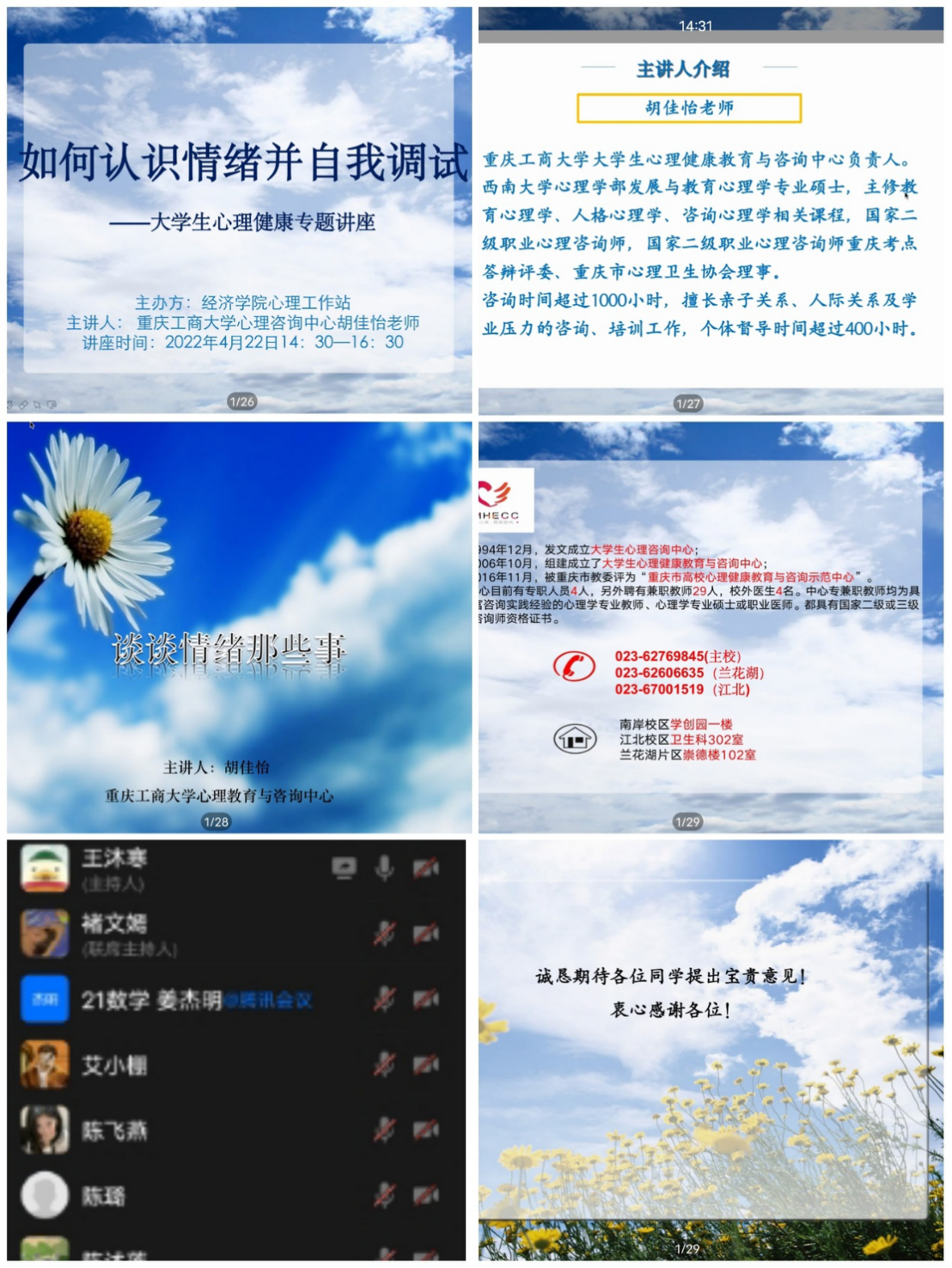 为进一步增强学生快乐学习、幸福生活的意识,重视学生心理健康状态,437437必赢国际心理工作站特邀学校心理咨询中心胡佳怡老师为通过线上形式为我院2020级、2019级100余名学生开展了“如何认识情绪并自我调适”专题讲座,本次讲座由437437必赢国际辅导员兼心理工作负责老师陈璐主持。