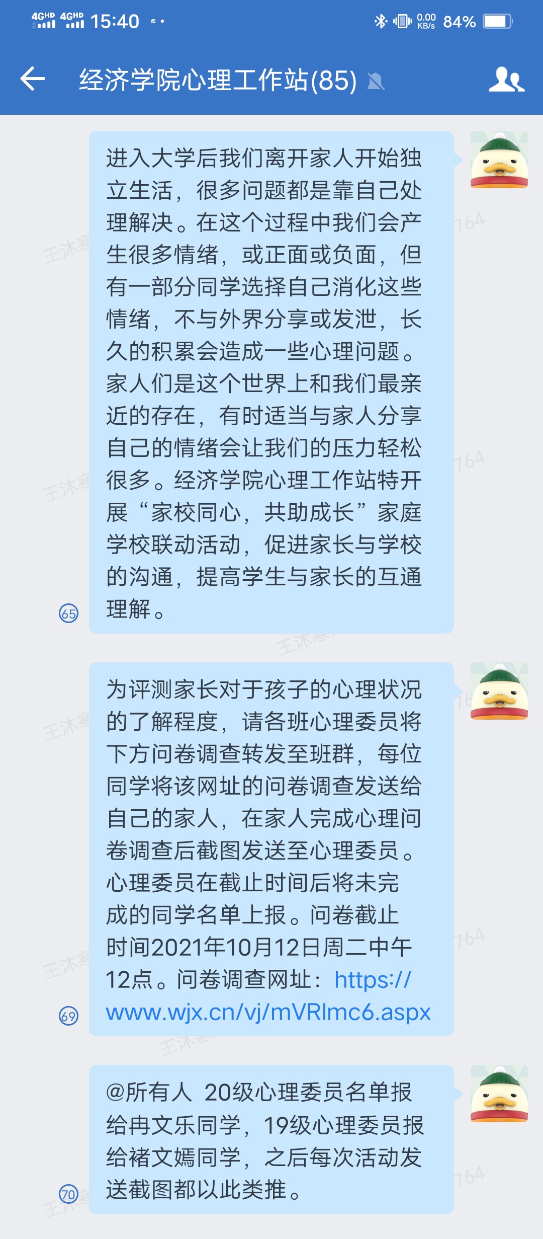 为更深入了解家长对大学生心理的关注情况,437437必赢国际心理工作站于10月11日向437437必赢国际2020级、2019级的学生家长们发放了《437437必赢国际2021-2022学年第一学期家长调查问卷》,并在10月12日写了《关注学生心理健康——致家长一封信》供各位家长在线阅读,随后收集了家长们对此信的读后感。