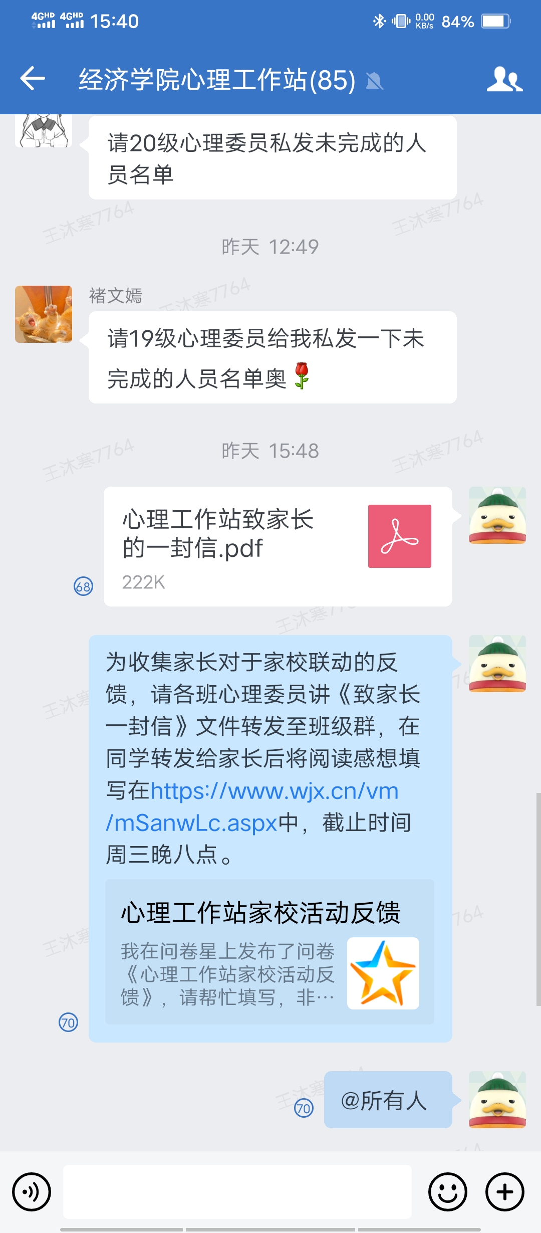 基于家长们的积极回应参与,心理工作站了解到家长们对此活动认同度较高、感触较深,有家长反馈:“很多时候我们会忙于工作,很少有时间和孩子们一起,认真聊聊他们内心的想法,很内疚,以后会吸取教训,多和孩子们沟通”,“能参加这样有意义的活动我很开心,孩子心理很健康,我也需要也多多沟通,孩子也喜欢事情多交流,以后也会多多注意孩子的心理健康问题”,“首先感谢学校和老师学生心理健康的关注。学生家长们纷纷表示,今后除了继续关心孩子的学习、生活情况外,同时也要注重关注孩子的心理状况、情绪变化等,积极沟通,正面引导,让孩子健康,阳光地成长。