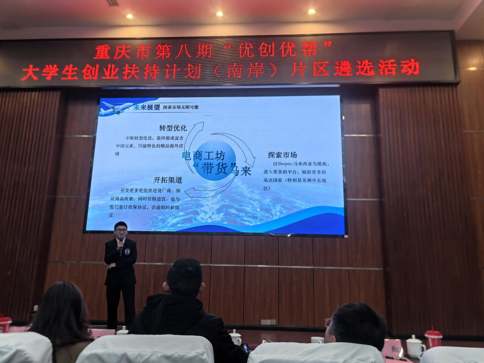 12月5日,重庆市第八期“优创优帮”大学生创业扶持计划南岸片区遴选赛在重庆第二师范学院举行。437437必赢国际由辅导员陈璐带队22级国贸专业“翠湖青年K7跨境电商工作室”负责人冯凯奇团队前往参赛。