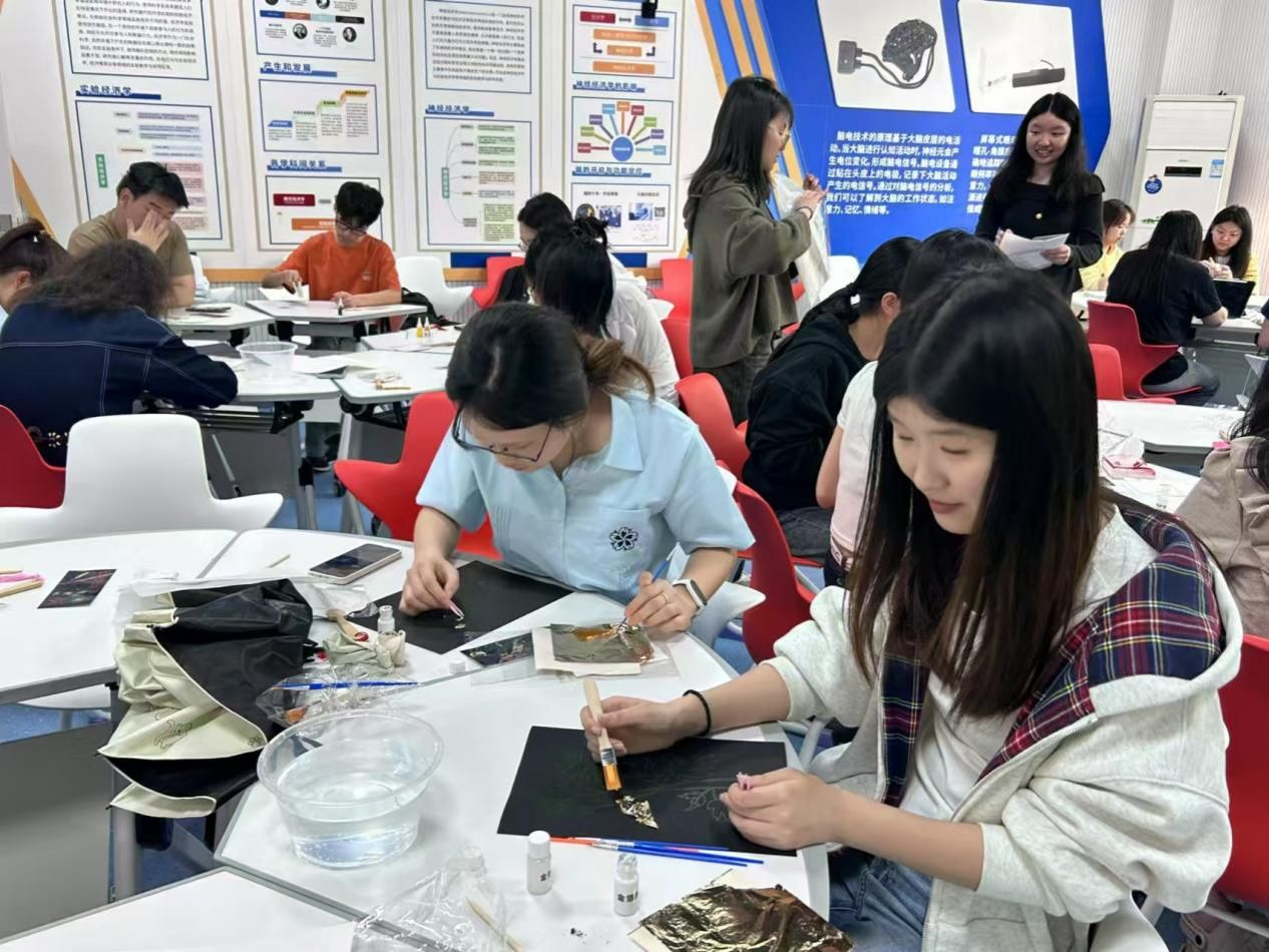 活动伊始,主持人简要介绍了各项手工活动的特点和制作技巧,并鼓励同学们充分发挥想象力和创新精神、大胆创作。在金箔贴画制作区,同学们小心翼翼地将金箔裁剪、粘贴,巧妙地组合成各种精美的图案,从传统的花鸟鱼虫到现代的抽象艺术,每一幅作品都闪耀着独特的光芒,金色的箔片在阳光下闪耀着独特的光芒,仿佛赋予了画作生命,让大家领略到了金箔艺术的魅力。